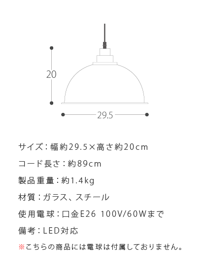 【Lサイズ】 サイズ:幅約29.5×高さ約20cm コード長さ:約89cm 製品重量:約1.4kg 材質:ガラス、スチール 使用電球:口金E26 100V/60Wまで 備考:LED対応 ※こちらの商品には電球は付属しておりません。
