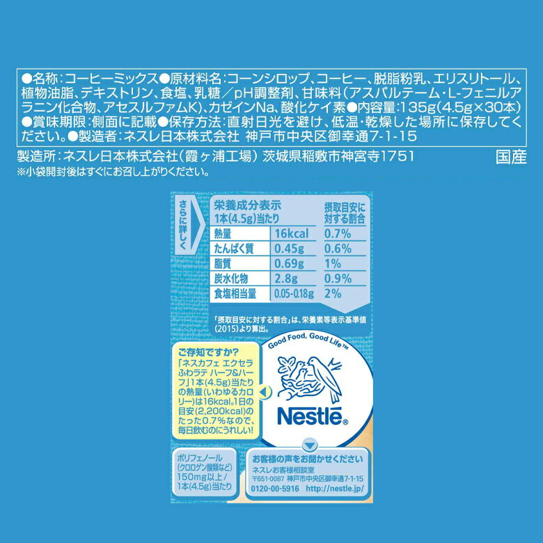 【原材料名】:コーンシロップ、コーヒー、脱脂粉乳、エリスリトール、植物油脂、デキストリン、食塩、乳糖/pH調整剤、甘味料(アスパルテーム・L−フェニルアラニン化合物、アセスルファムK)、カゼインNa、酸化ケイ素【製造者】:ネスレ日本株式会社兵庫県神戸市中央区御幸通7-1-15 ネスレハウス