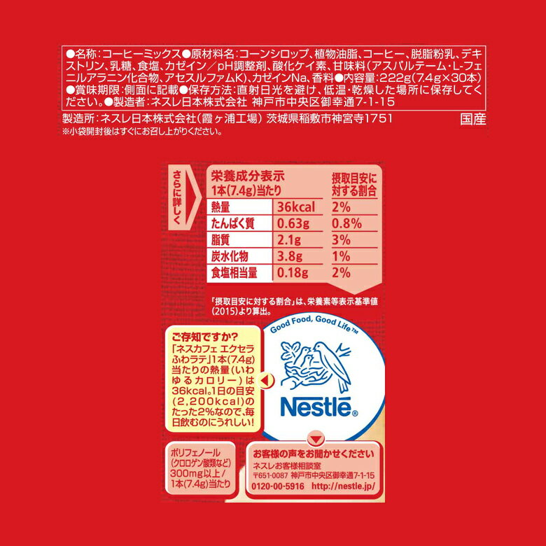 【原材料名】:コーンシロップ、植物油脂、コーヒー、脱脂粉乳、デキストリン、乳糖、食塩、カゼイン/pH調整剤、酸化ケイ素、甘味料(アスパルテーム・L−フェニルアラニン化合物、アセスルファムK)、カゼインNa、香料【製造者】:ネスレ日本株式会社兵庫県神戸市中央区御幸通7-1-15 ネスレハウス